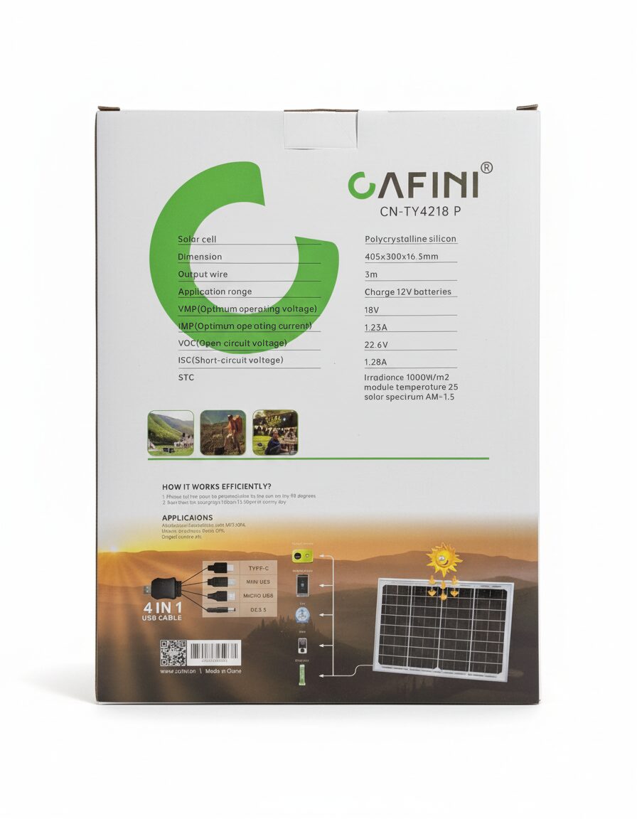 El Panel Solar 22W 18V representa una excelente inversión para quienes buscan eficiencia y fiabilidad en energías renovables. Fabricado con tecnología de silicio policristalino, este panel asegura una óptima conversión de la luz solar en electricidad, incluso en condiciones de baja irradiancia. Su diseño compacto y ligero lo hace versátil para una amplia gama de instalaciones, desde sistemas fotovoltaicos pequeños hasta componentes de kits solares más complejos.